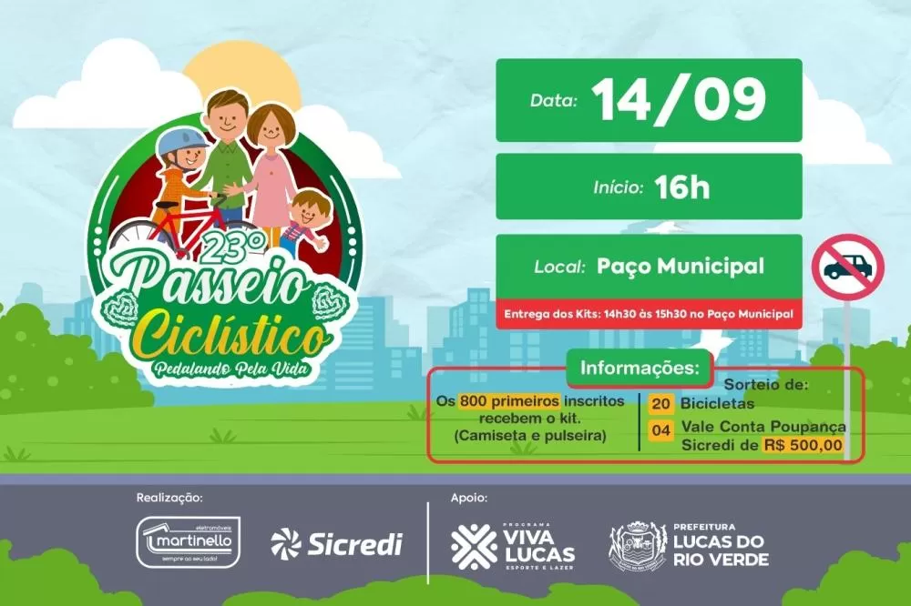 A entrega dos kits será antes de iniciar o passeio, das 14h às 15h30, na rotatória do Paço Municipal