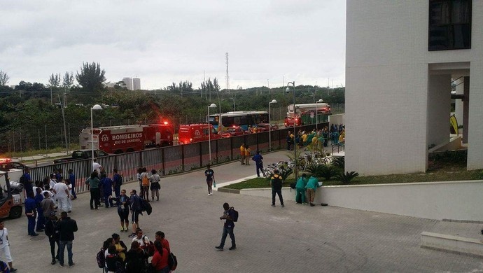 Na Vila Olímpica, fumaça em caixa de papelão na escada assusta os australianos. Princípio de incêndio é contido rapidamente e atletas voltam aos apartamentos.