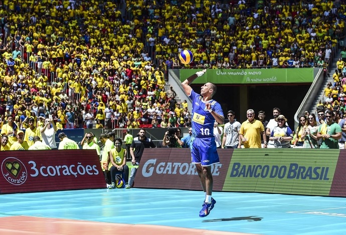 Maior líbero da história se despede da seleção com festa no Mané Garrincha e marca ace em vitória sobre Portugal. Contra o sol, jogadores usam óculos, bonés e toalhas.