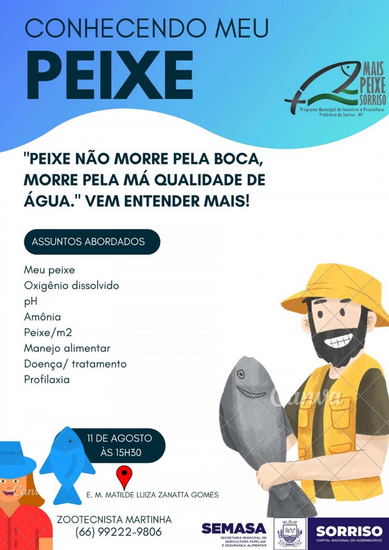 “O peixe não morre pela boca, morre pela má qualidade de água”. É com esse tema sugestivo que técnicos do programa Mais Peixe, gerido pela Secretaria de Agricultura Familiar e Segurança Alimentar (Semasa), irão apresentar estratégicas de manejo para fomentar a produção de pescado em Sorriso.