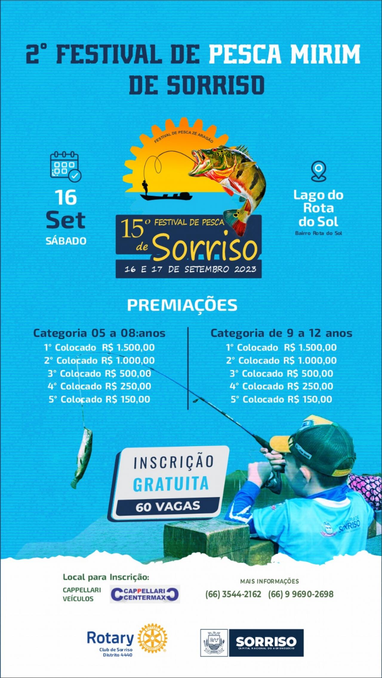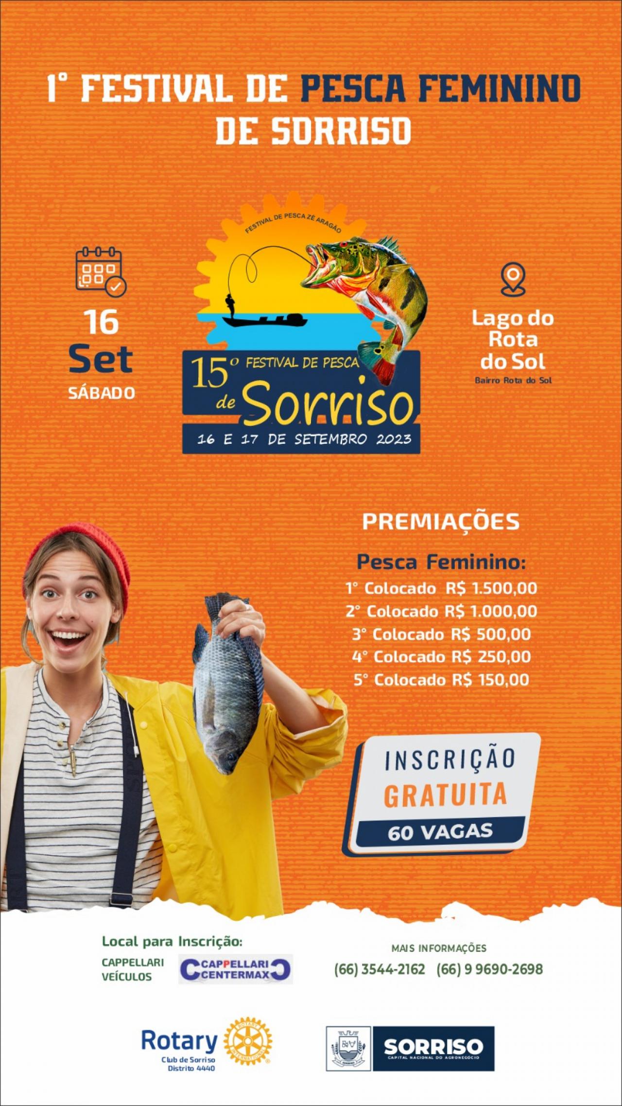 Entre os dias 16 e 17 de setembro, Sorriso será sede da 15.ª edição do Festival de Pesca Zé Aragão, realizado pelo Rotary Clube Sorriso com o apoio da Prefeitura Municipal. E como na edição do ano passado, 2023 também vem com novidades: neste ano será realizado o 1.º Festival de Pesca Feminino; além do 2.º Festivais com Caiaque e Mirim. E durante o Festival de Pesca, também vão rolar competições de beach tennis, futevôlei e vôlei de praia.