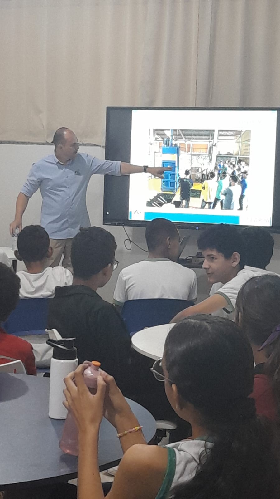 Após a palestra na escola, Rangel foi até a Central de Recebimento de Embalagens e, por meio de videochamada, mostrou um pouco do funcionamento da unidade. “Ao vivo eles conseguiram ver o passo a passo aqui da reciclagem, conhecendo o descarregamento de um caminhão, a forma de triagem do material, a compactação e a estocagem”.