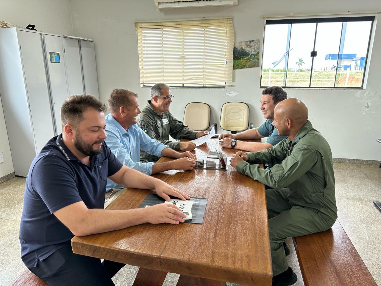 O prefeito em exercício, Gerson Bicego, acompanhado pelo presidente da Associação Comercial e Empresarial de Sorriso (Aces), Savio Junior Zaniolo e Nilson Molonha de Alencar, diretor da Aces e responsável pela realização do Natal Luz reuniram-se com o tenente-coronel PM Ênio Teixeira da Silva e o major PM Marcelo Gusmão Oliveira para definir datas e horários dos voos de helicóptero que marcará a abertura do Natal Luz com chegada do Papai Noel pelo ar.