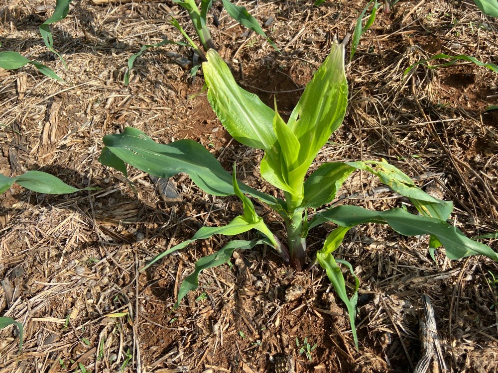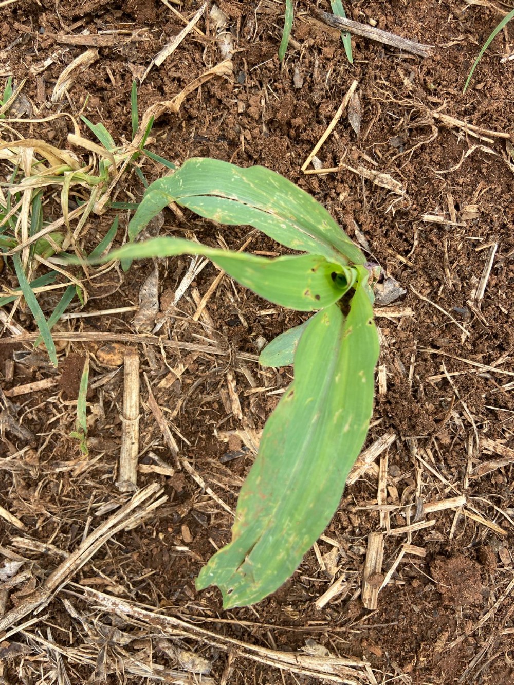 Se o meristema apical não for danificado, as primeiras folhas que emergem do cartucho podem apresentar estrias esbranquiçadas transversais, muitas vezes com perfurações de halo amarelado, causadas pelas puncturas feitas pelo inseto durante a alimentação na base da planta jovem. Quando as folhas do cartucho não conseguem se desenrolar, a planta pode adquirir um aspecto de "encharutamento".