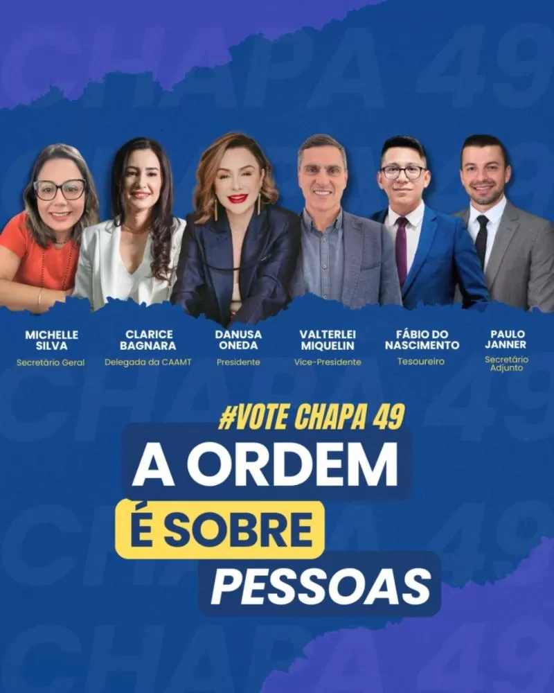 A chapa ‘A Ordem é sobre pessoas!’ é composta, além de Danusa Oneda, Presidente, por Valterlei Miquelin como Vice-presidente, Fábio do Nascimento, Tesoureiro, Michelle Silva, Secretária Geral, Paulo Janner, Secretário Adjunto, e Clarice Bagnara, como Delegada da CAAMT.
