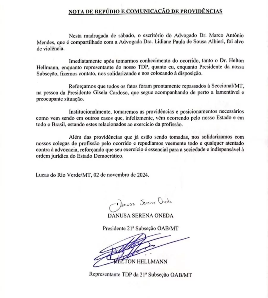 A Ordem dos Advogados do Brasil – Seccional Mato Grosso (OAB-MT) repudia veementemente o atentado contra um prédio onde funcionam dois escritórios de advocacia em Lucas do Rio Verde, na madrugada deste sábado (2/11).