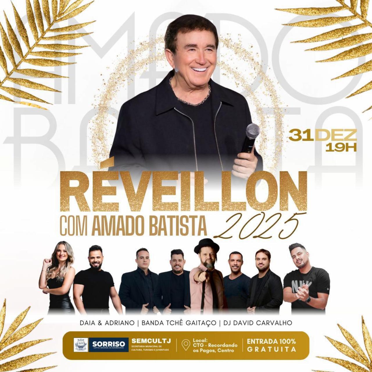 Por meio de uma parceria entre o Governo do Estado de Mato Grosso e a Prefeitura de Sorriso, a chegada de 2025 vai ser celebrada com muita música, com o ícone da cultura popular Amado Batista. O palco da festa que fecha 2024 e abre 2025 será a arena do CTG Recordando os Pagos, com abertura dos portões às 18h30 do dia 31 de dezembro.