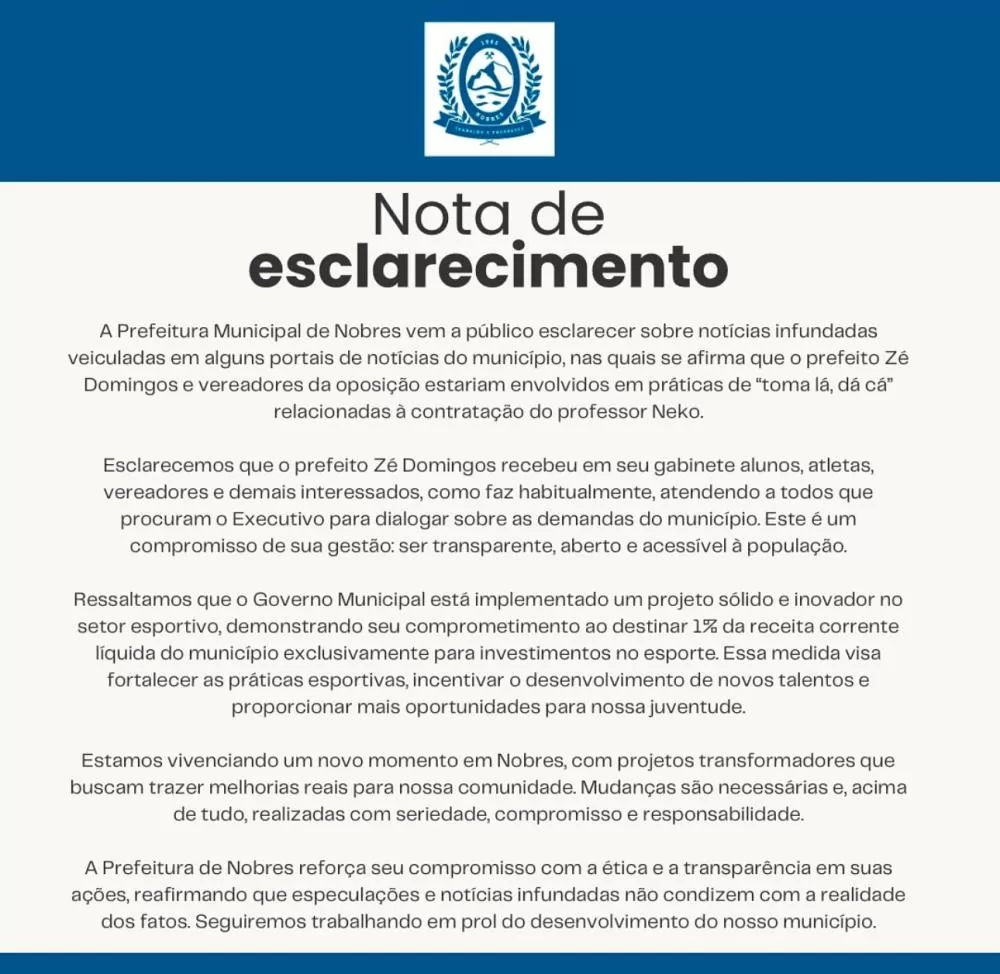 A Prefeitura Municipal de Nobres se manifestou recentemente para esclarecer informações equivocadas que circularam em alguns portais de notícias locais. As alegações de que o prefeito Zé Domingos e vereadores da oposição estariam envolvidos em práticas ilícitas relacionadas à contratação do professor Neko foram categóricamente negadas.