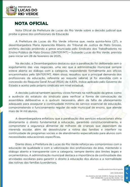 A desembargadora justificou sua decisão pela falta de esgotamento das negociações entre a administração municipal e o sindicato. A Prefeitura de Lucas do Rio Verde se mostrou aberta ao diálogo e atendeu à principal demanda dos educadores, oferecendo um reajuste salarial de 4,83%, conforme o Reajuste Geral Anual (RGA) aplicado pelo Governo do Estado.