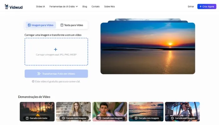 Se você quer testar essa tecnologia, o Vidwud é uma ótima opção, combinando facilidade de uso com resultados de alta qualidade para transformar foto em vídeo online grátis. O Vidwud se destaca por combinar essas tecnologias em uma plataforma intuitiva, permitindo que usuários comuns criem vídeos impressionantes sem conhecimentos técnicos. Experimente e surpreenda-se com o que a IA pode fazer por suas imagens!