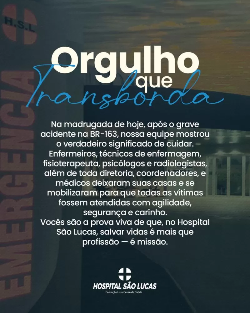 O Hospital São Lucas (HSL) mobilizou equipes e abriu, de forma emergencial, a recém-inaugurada ala de UTI para atender as vítimas do grave acidente entre um ônibus e uma carreta ocorrido na noite da última sexta-feira (8), na BR-163, em Lucas do Rio Verde. Ao todo, 25 pacientes foram recebidos na unidade.