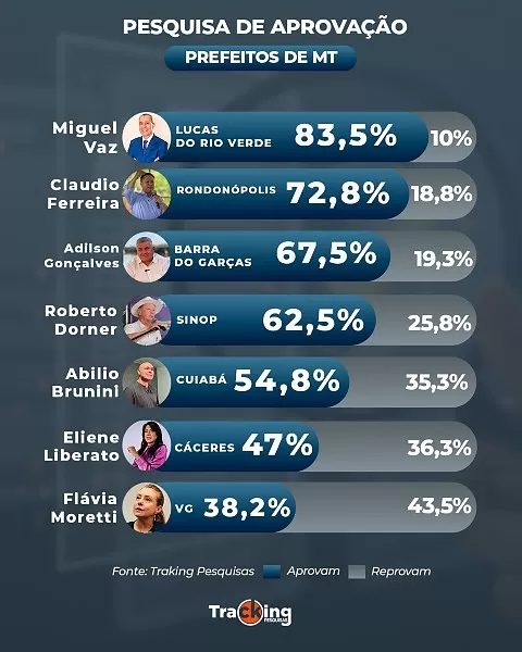 O prefeito de Lucas do Rio Verde, Miguel Vaz (Republicanos), alcançou o posto de gestor municipal mais bem avaliado de Mato Grosso entre as maiores cidades do estado. Os dados são da Tracking Pesquisas, que revelou um índice de aprovação de 83,5% dos eleitores luverdenses.