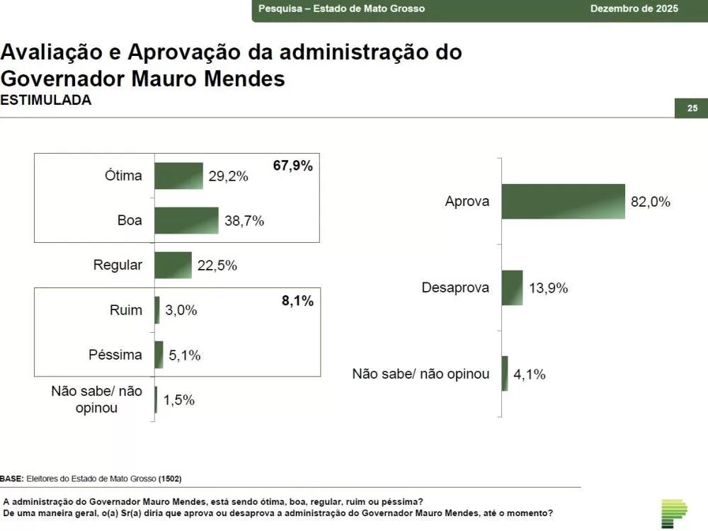 A pesquisa reflete o sentimento do eleitorado em um momento de grandes investimentos em infraestrutura, saúde e segurança pública em todo o estado. O índice de aprovação de Mendes é um dos mais altos entre os governadores do Brasil, o que reforça sua influência política para os próximos pleitos.