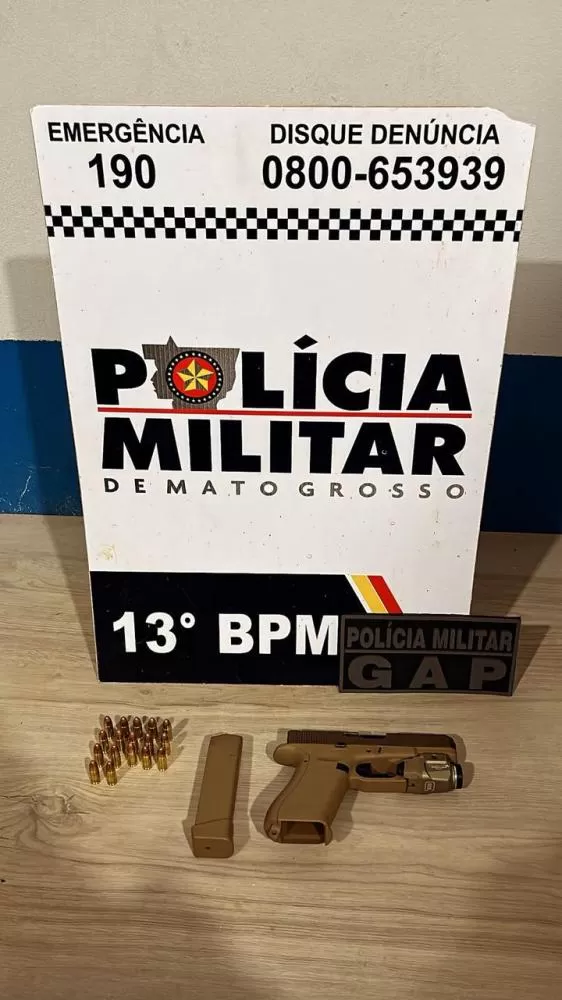 Com as características dos denunciados, os policiais militares reforçaram o policiamento na região e localizaram dois homens em uma moto Honda Biz, no bairro Tijucal. Durante abordagem, um homem foi flagrado com uma arma de fogo e diversas munições.