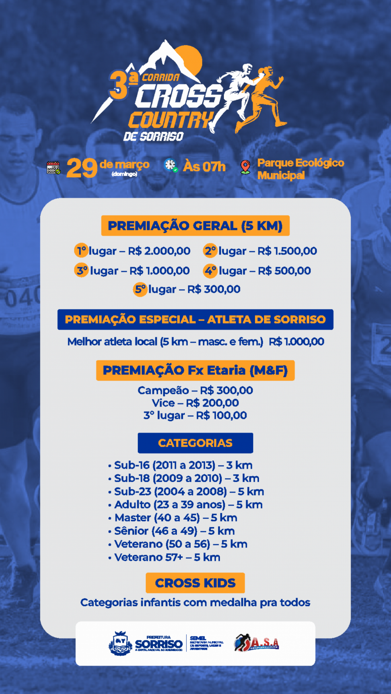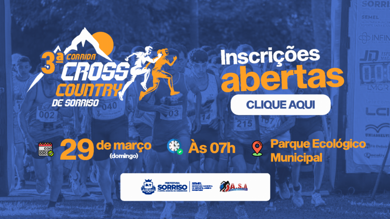 Estão abertas as inscrições para a 3ª Corrida Cross Country, promovida pela Prefeitura de Sorriso, por meio da Secretaria Municipal de Esporte, Lazer e Juventude. A prova acontece no dia 29 de março, no Parque Ecológico, com percursos de 3 km e 5 km.
