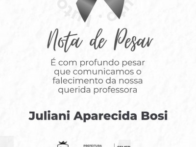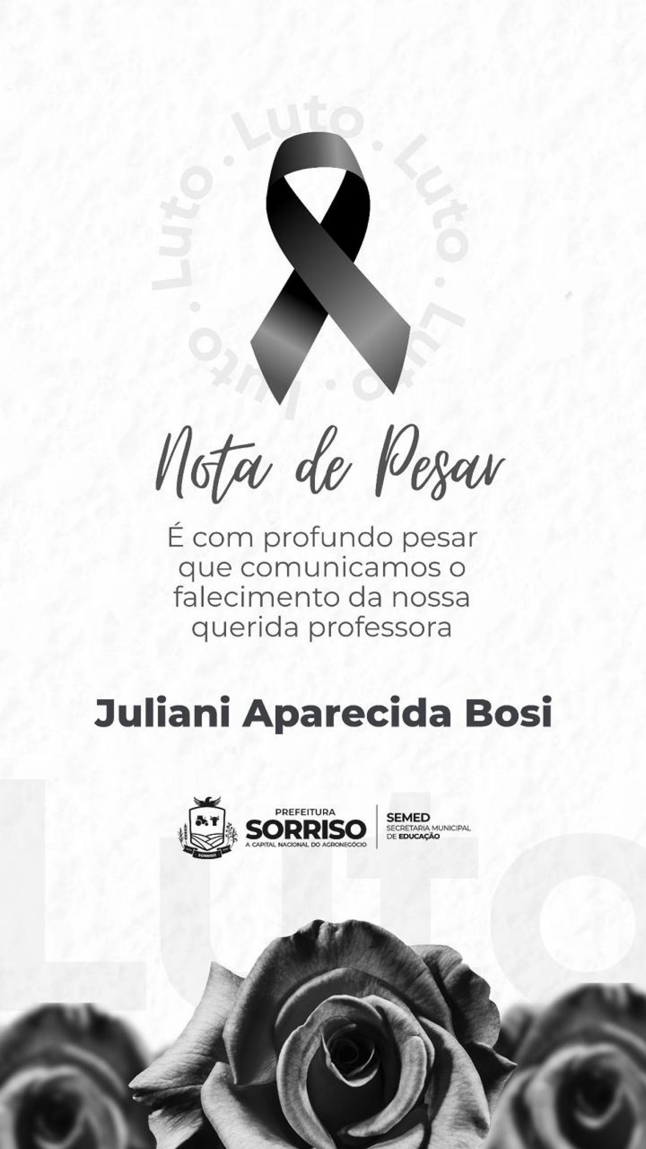É com imenso pesar que a Prefeitura de Sorriso, por meio da Secretaria Municipal de Educação (Semed) informa o falecimento da professora Juliani Aparecida Bosi, nesta quinta-feira (2 de abril), depois de passar quase dois meses internada por conta de complicações decorrentes de uma cirurgia.
