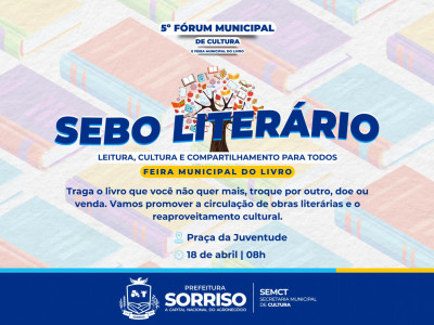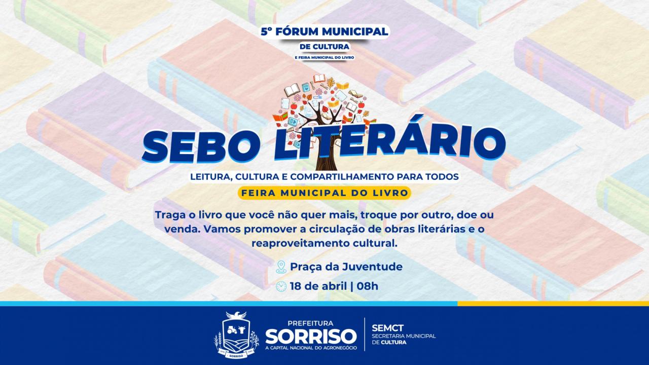 Vale lembrar que o Sebo Literário é uma ação cultural que integra a programação da Feira Municipal do Livro de 2026 que celebra o V Fórum Municipal de Cultura de Sorriso. A programação da Feira inicia nesta quinta-feira, dia 16, às 18h45 na Praça da Juventude. Já às 20h30, ponto alto da noite, terá início a palestra com o escritor e poeta Bráulio Bessa. Bráulio também estará na cidade amanhã, dia 17, quando participará de roda de conversa com escritores locais.