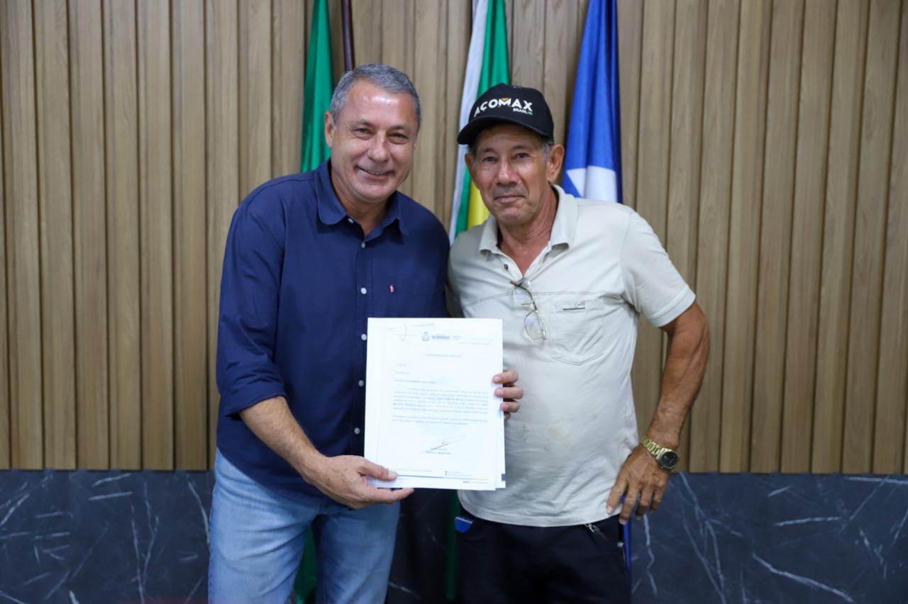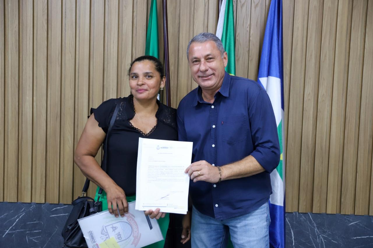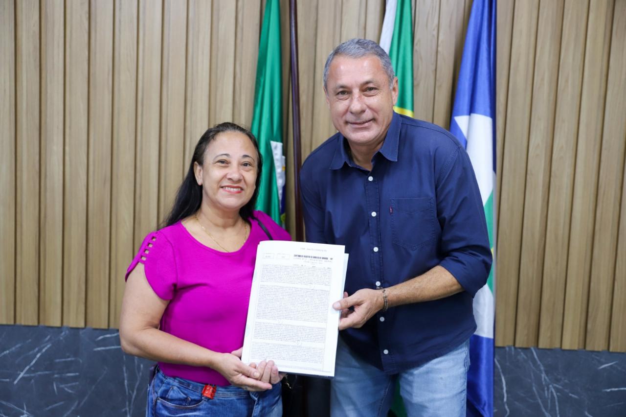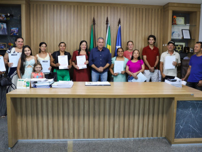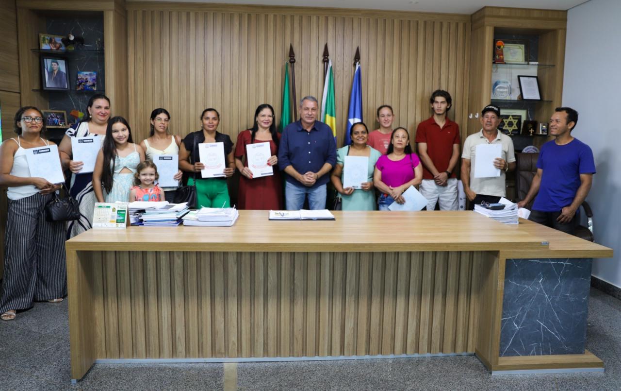 As duas mulheres integraram um grupo de 18 pessoas que vieram até o gabinete do prefeito Alei Fernandes receber o documento que viabiliza a emissão, no cartório, das escrituras de imóveis localizados nos bairros São José, Nova Aliança, São Francisco e São Domingos.