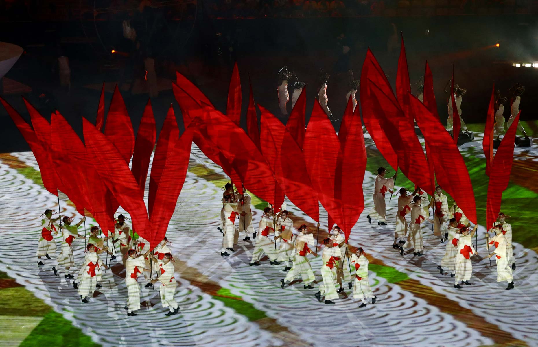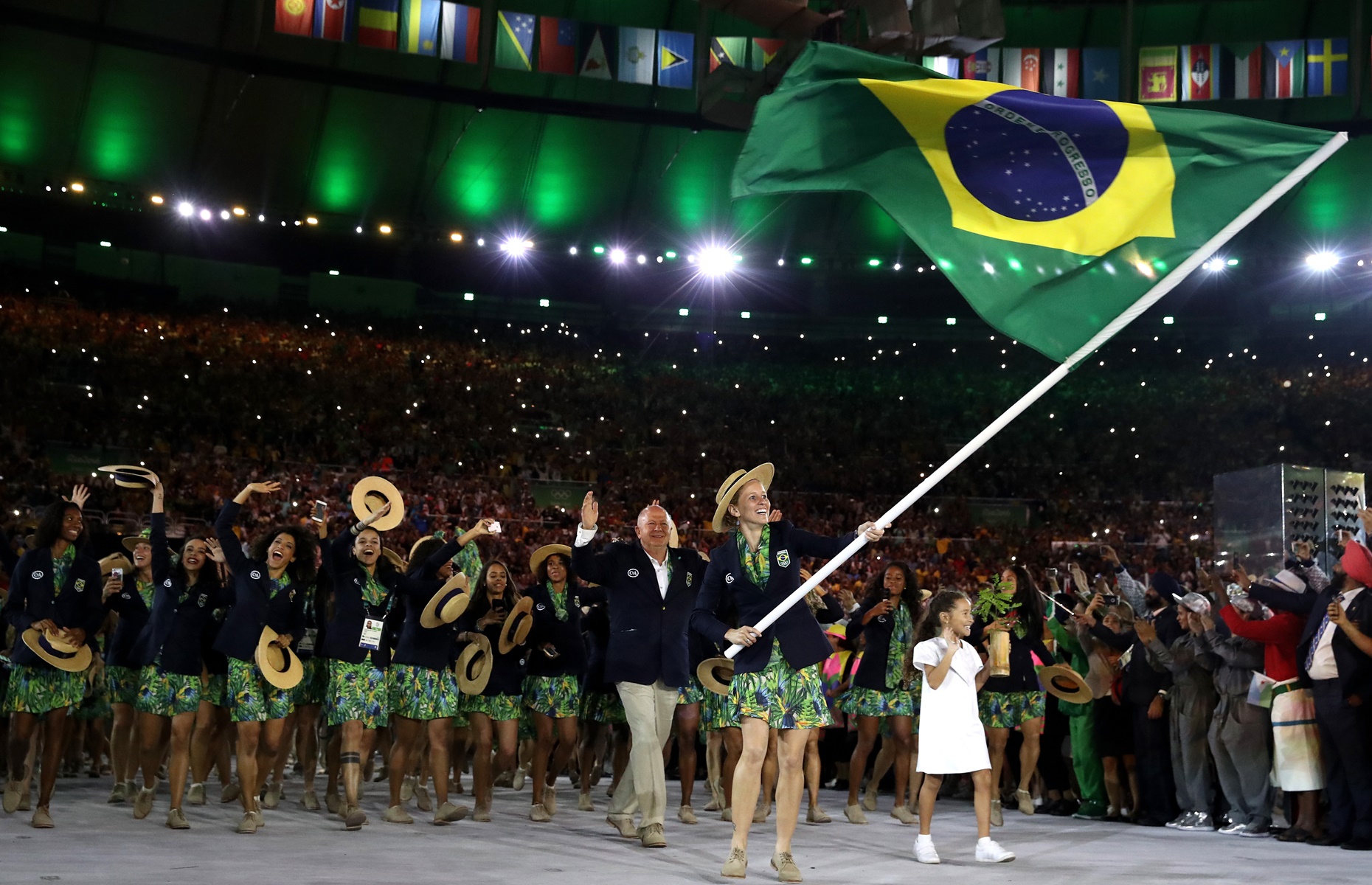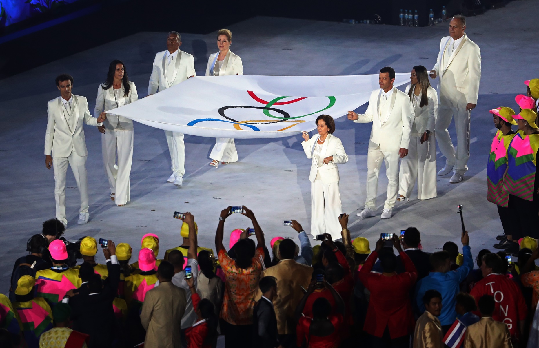 Depois dos discursos de Nuzman e Bach, Emanuel, Marta, Torben Grael, Joaquim Cruz, Sandra Pires e Oscar Schmidt carregaram a bandeira olímpica para dentro do estádio.