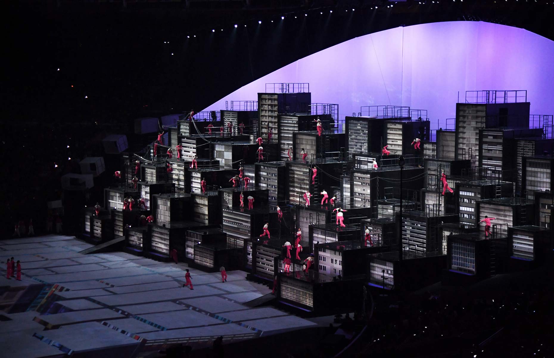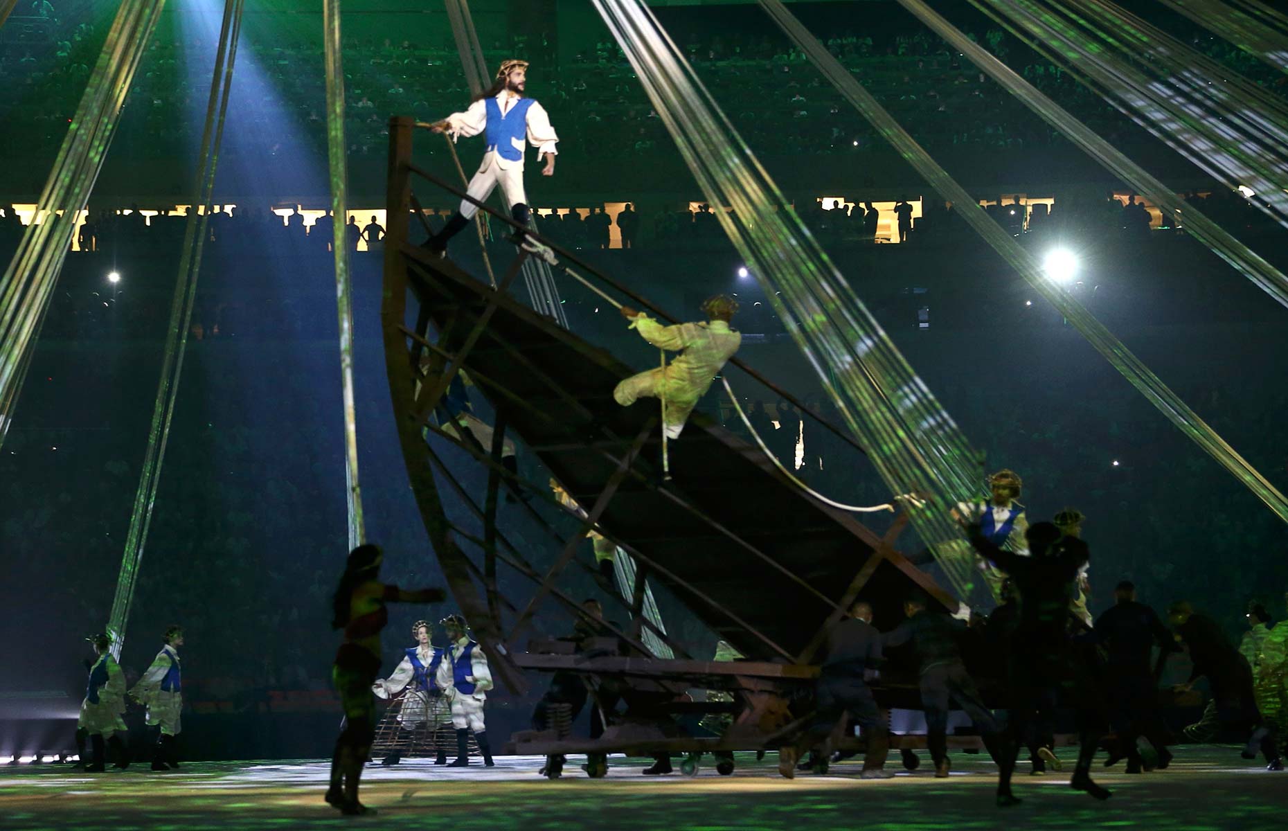 Com a parte artística já rolando no palco do Maracanã, a apresentação iniciou falando justamente da história do Brasil, passando pela descoberta pelos portugueses até a escravidão.