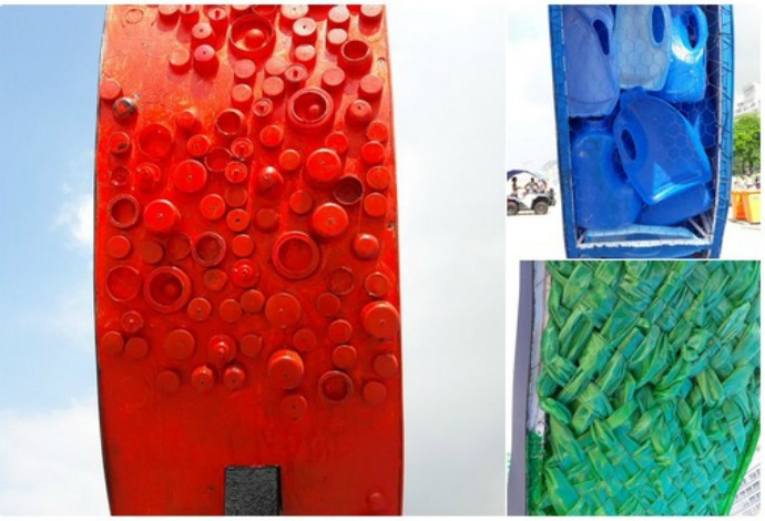 Em frente à escultura, um cubo com inscrições em braile explicam a ideia dos agitos. Na técnica de reciclagem escolhida pelos artistas, os plásticos são triturados, aquecidos e prensados. Assim, formam outra chapa para compor a base de cada um dos três agitos (vermelho, verde e azul). O azul, por exemplo, foi produzido com uma tela por fora e garrafas de amaciantes por dentro, com aroma de limpeza. Para preencher e dar mais resistência para a escultura, os artistas escolheram usar garrafas PET. Ex-atleta de judô e atletismo, Davisilas Santos Souza disse que nunca havia experimentado nada parecido.