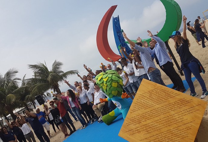 Após os aros olímpicos, foram inaugurados nesta sexta-feira na Praia de Copacabana os agitos paralímpicos, escultura que será o símbolo da Paralimpíada do Rio de Janeiro. A obra de 4m de altura e 3m de comprimento, feita com material reciclado, tem diversas texturas e aromas. A artista plástica Elisa Brasil trabalhou em parceria com o cenógrafo Tejota Bastos para transformar o lixo em arte e aguçar os cinco sentidos, mesclando os conceitos de inclusão, interatividade e sustentabilidade. Os agitos remetem à ideia de movimento. Crianças e jovens municipais ajudaram a recolher o plástico usado na instalação e participaram do processo de criação. Alguns dos materiais foram tirados inclusive da praia onde está exposto o trabalho artístico.