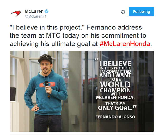 - Eu acredito neste projeto. Estou comprometido e quero ser campeão com a McLaren-Honda. Este é o meu único objetivo - postou a McLaren em sua conta no Twitter.