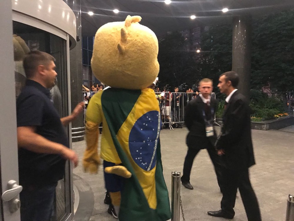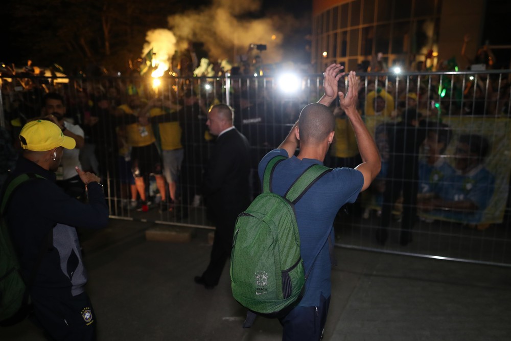 Comandados agora pelo mascote da Seleção, o Canarinho Pistola, cerca de 400 torcedores marcaram presença na porta do hotel e mostraram animação para recepcionar os jogadores. Cantaram as famosas músicas de incentivo ao Brasil e de provocação aos argentinos.