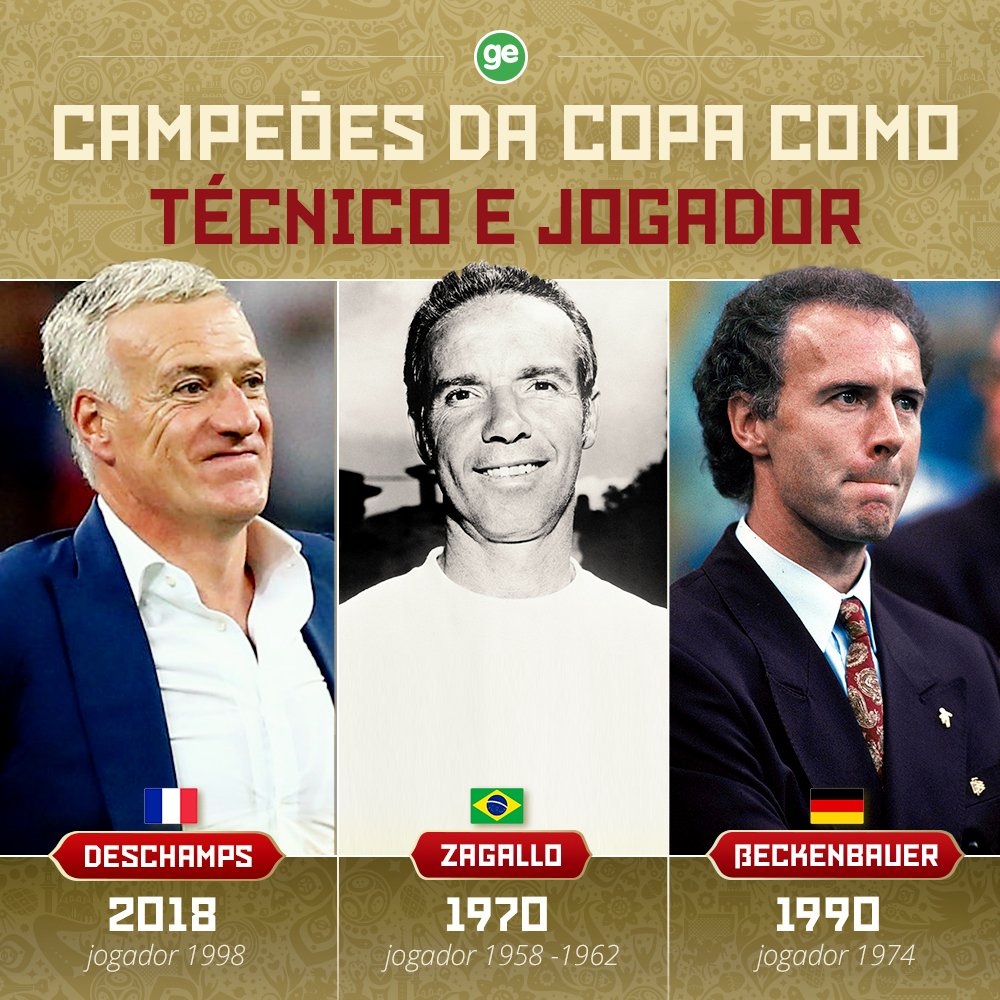 Didier Deschamps entrou neste domingo, com a vitória de 4 a 2 sobre a Croácia, para um seletíssimo rol: o de campeões da Copa do Mundo como jogador e treinador. Agora são três nesse grupo: Zagallo (1958, 62 e 70), Franz Beckenbauer (1974 e 90) e o francês, que foi capitão em 1998 e técnico agora de estrelas como Mbappé, Pogba e Griezmann.
