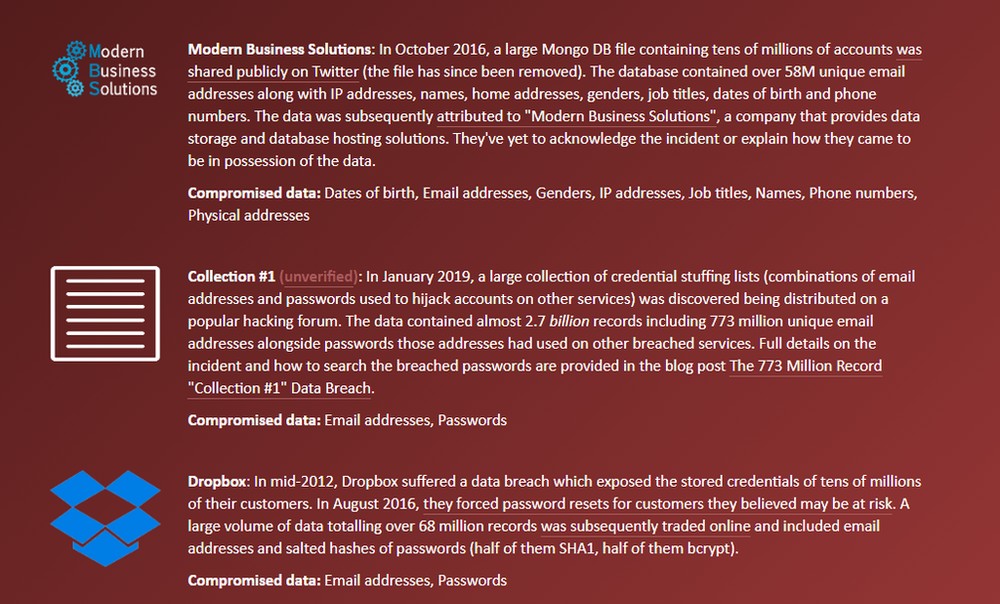 Para saber se seu endereço de e-mail e senhas foram comprometidos, é possível utilizar as consultas do HIBP, aqui e aqui.
