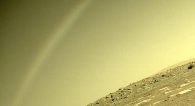 Esta foto, tirada em abril, cerca de dois meses após o pouso da Nasa, foi uma das que deram o que falar. O clique viralizou na internet e internautas se questionaram se o aparente fenômeno luminoso poderia ser um arco-íris. Após a repercussão, astrônomos da agência espacial se pronunciaram e explicaram que tudo não passava de mera ilusão de ótica provocada pelo reflexo das lentes da câmera