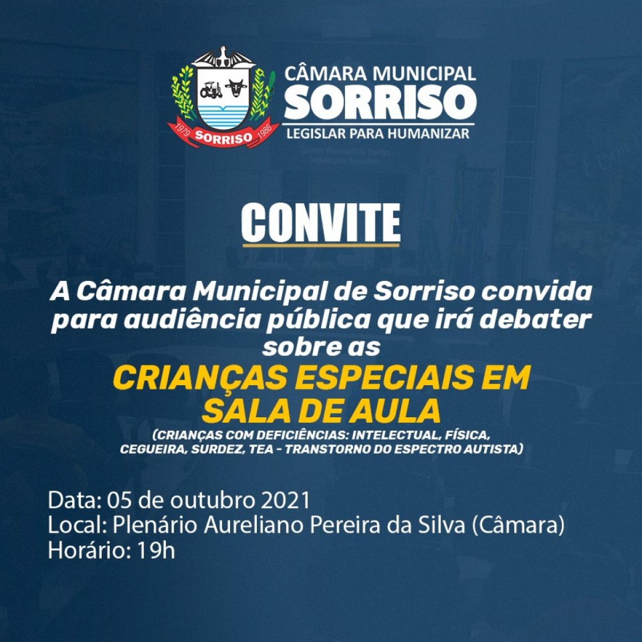 A Câmara de Sorriso realizará, no próximo dia 5, uma audiência pública para debater sobre as crianças especiais matriculadas e em sala de aula nas escolas de Sorriso. O encontro será às 19 horas, no plenário Aureliano Pereira da Silva, na Casa de Leis.