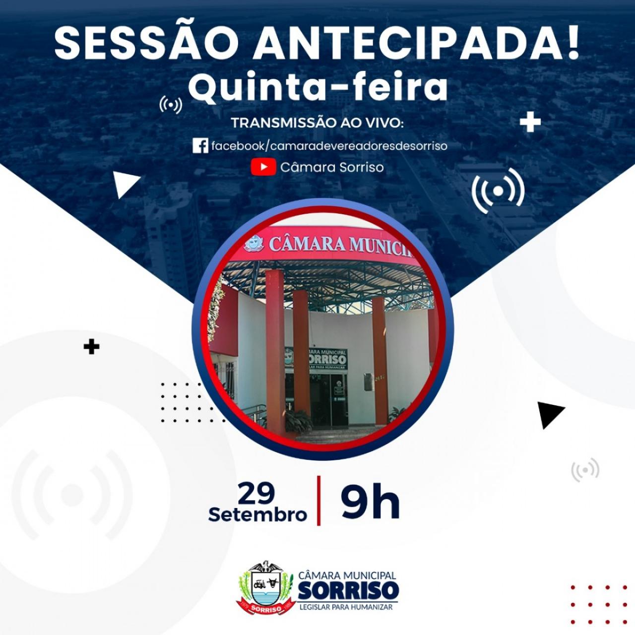 Devido à aprovação de urgência de alguns projetos do Poder Executivo, a Câmara Municipal de Sorriso, através da Portaria 145/2022, antecipará a 33ª Ordinária para quinta-feira (29), às 9h, no plenário.