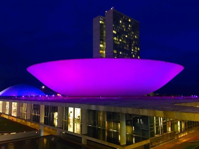 Divulgação/Câmara dos Deputados Cúpulas do Congresso iluminadas de roxo O Congresso Nacional ganha iluminação roxa, na noite desta quinta-feira (...