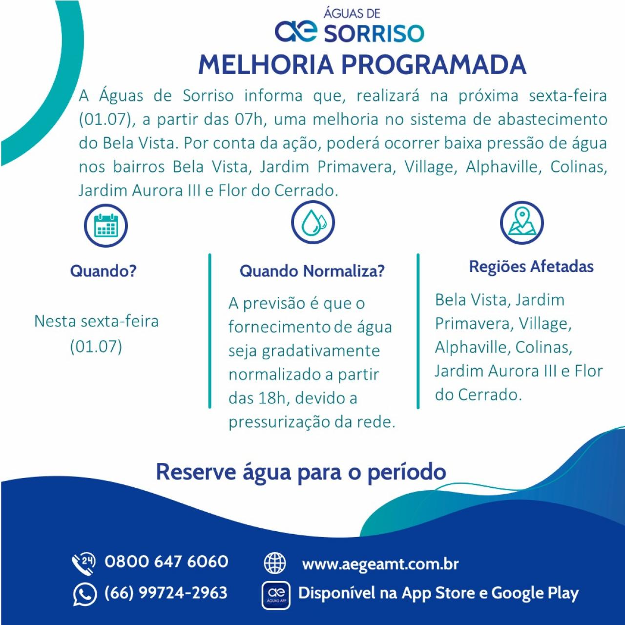 Águas de Sorriso alerta que pode ocorrer baixa pressão em 7 bairros