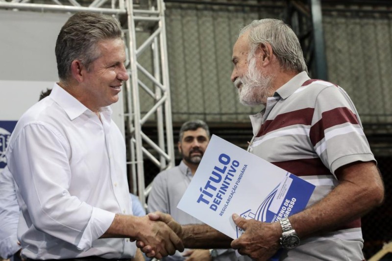 O governador Mauro Mendes fez a entrega de títulos de regularização fundiária a moradores dos bairros Cristo Rei, Dom Orlando Chaves, Cohab Dom Bosco e Cohab Jayme Campos