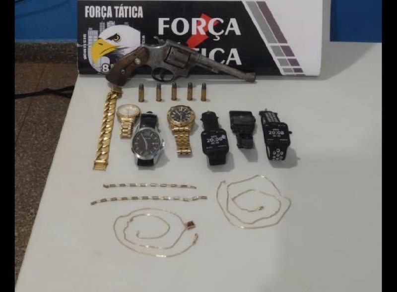 Uma bolsa com relógios, correntes de ouro e outros objetos de valor que estavam em posse do suspeito baleado foram apreendidos na ação policial