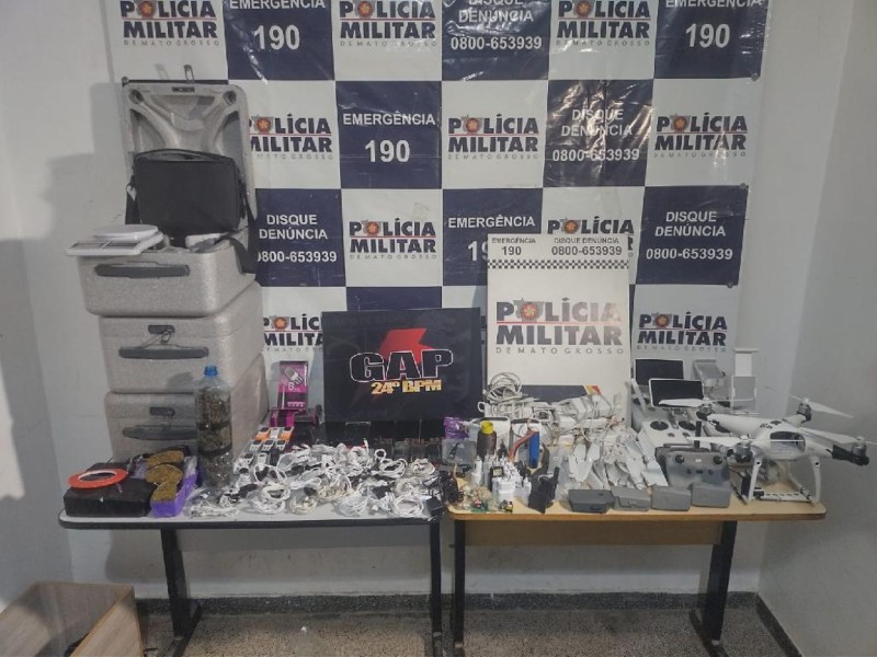 Com os suspeitos foram apreendidos mais de 1,7 kg de maconha, um drone, 44 carregadores, 13 fontes de carregador, fones de ouvido, baterias para drone, 47 hélices de drone, nove carregadores de drone, dentre outros objetos