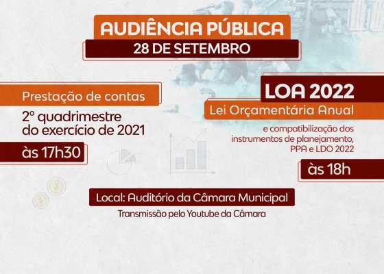 Na mesma data será realizada audiência de prestação de contas do 2º quadrimestre de 2021