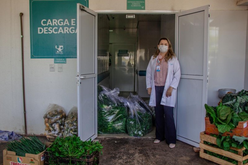Ao hospital filantrópico foram entregues diversas hortaliças como alface, cebolinha, rúcula, almeirão, além de legumes e verduras como abóbora, abobrinha, quiabo e jiló