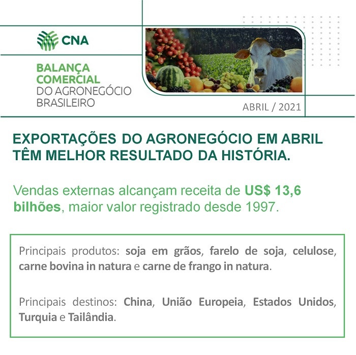 Brasília (19/05/2021) – As exportações do agronegócio em abril bateram recorde e chegaram a US$ 13,6 bi...