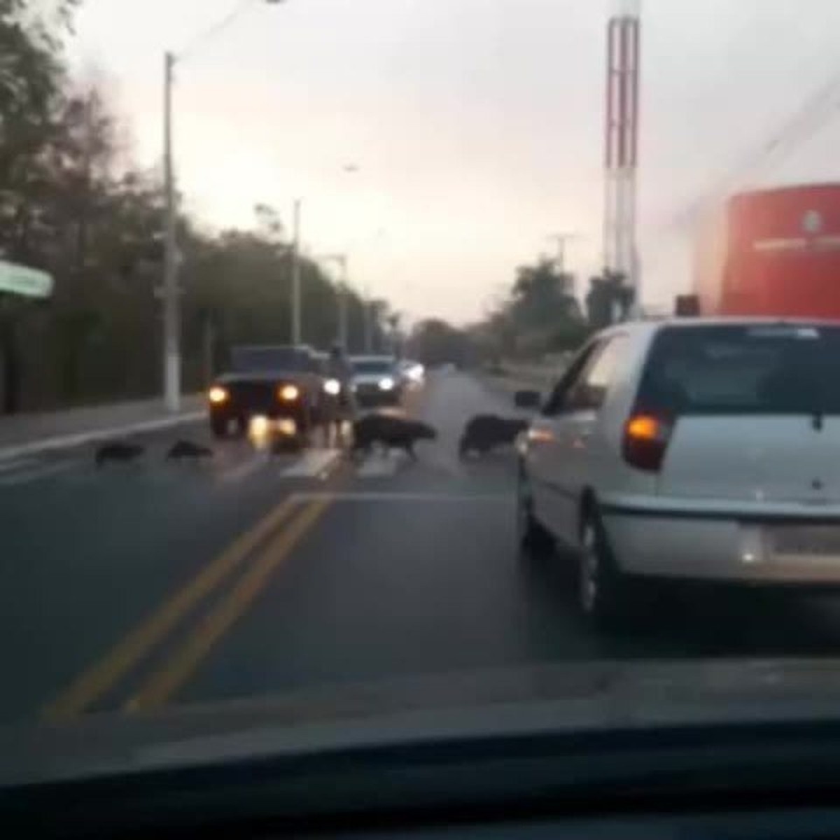 Família de capivaras é flagrada atravessando faixa de pedestres em horário de pico em Cuiabá