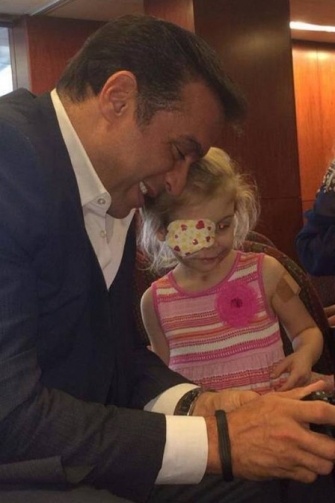 Menina com cicatrizes no rosto recebe visita de médico